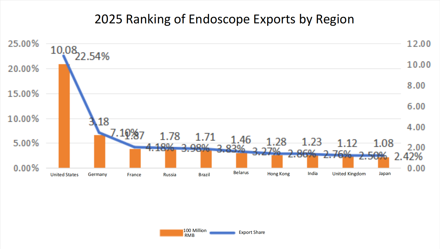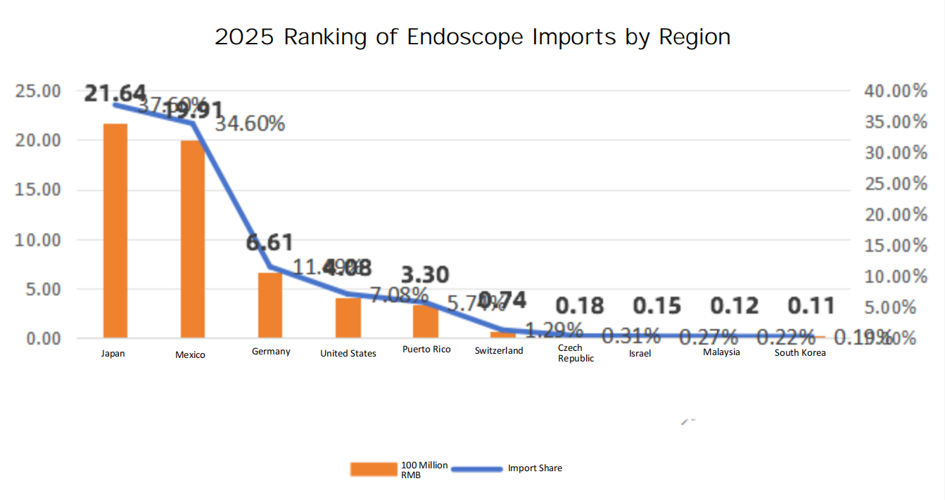 In 2025, the import value was approximately 5.755 billion RMB. Imports involved 37 countries and regions, with the top 10 accounting for 98.79% of the total. These leading partners are Japan, Mexico, Germany, the United States, Puerto Rico, Switzerland, the Czech Republic, Israel, Malaysia, and South Korea—all of which are powerhouses in endoscope manufacturing or processing.