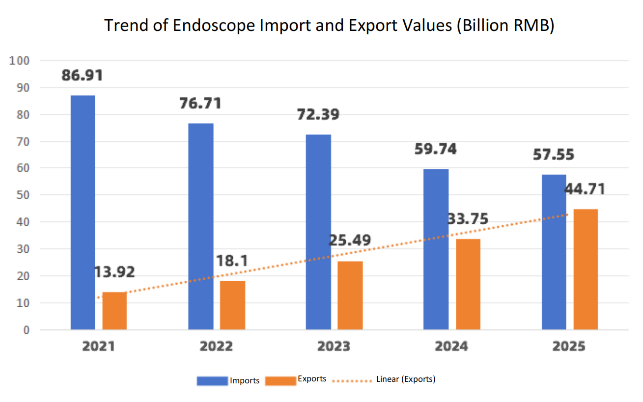 In 2025, China’s trade in endoscopes [Category 9018 (complete units), parts and accessories] still faced a massive deficit, though it is shrinking at a visible pace: