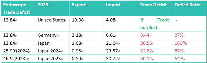 As shown by the red text in the chart above, the overall endoscope trade deficit is shrinking year by year, and even the deficit with Japan is decreasing. However, the deficit with Japan remains massive at 2.056 billion RMB! This figure has already surpassed China’s overall endoscope trade deficit of 1.284 billion RMB in 2025. Furthermore, the proportion of the trade deficit with Japan is rising annually!
